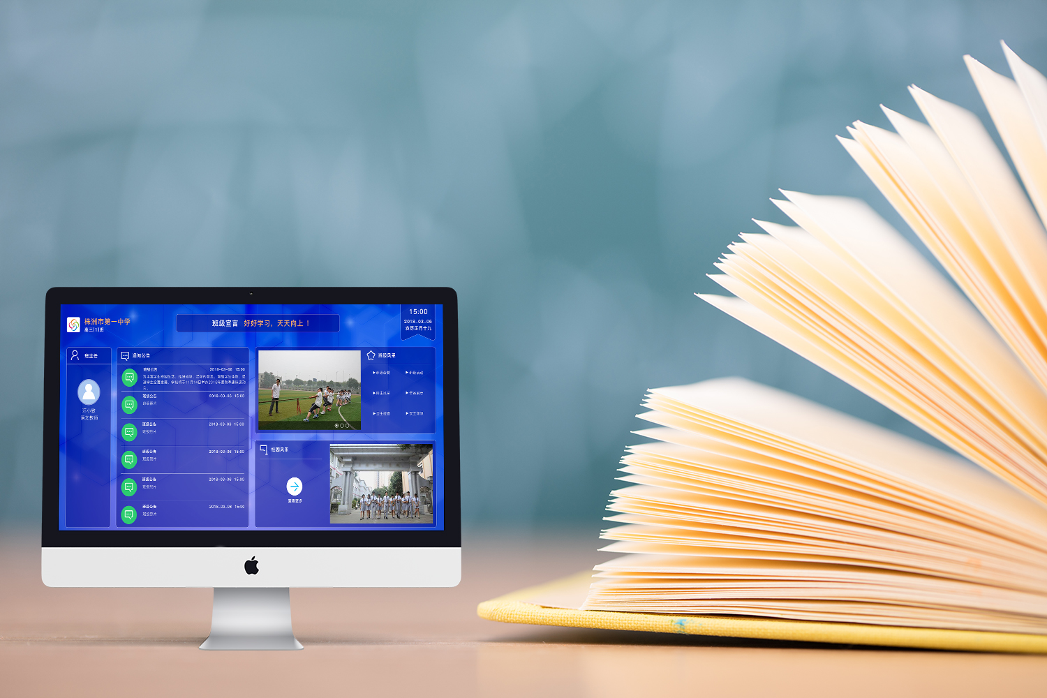 數字化形式的班牌,是一種應用于教育教學的電子顯示設備,可以是數碼相框,也可以是平板電腦等。電子班牌的存儲與交換介質采用USB接口、網絡接口或存儲卡模式等,通過音視頻、網絡、電視信號等格式進行內容的呈現,可以實現與班級文化建設相關的班徽、音樂、視頻、照片幻燈式播放、時鐘顯示、通知公告、班級考核等。